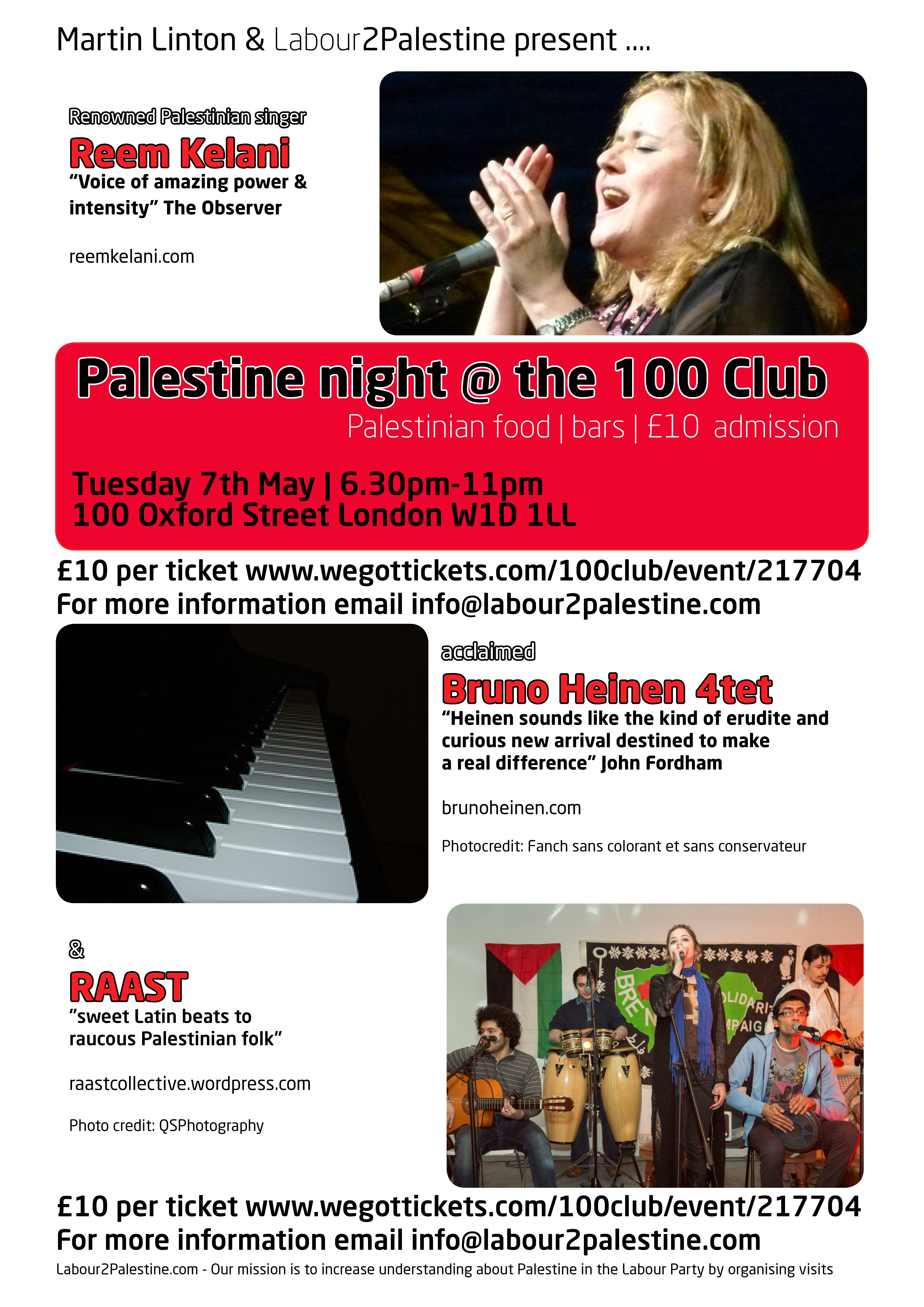 For your chance to win two tickets to the Reem Kelani gig at the 100 Club like Labour2Palestine on facebook and/or follow us on twitter.