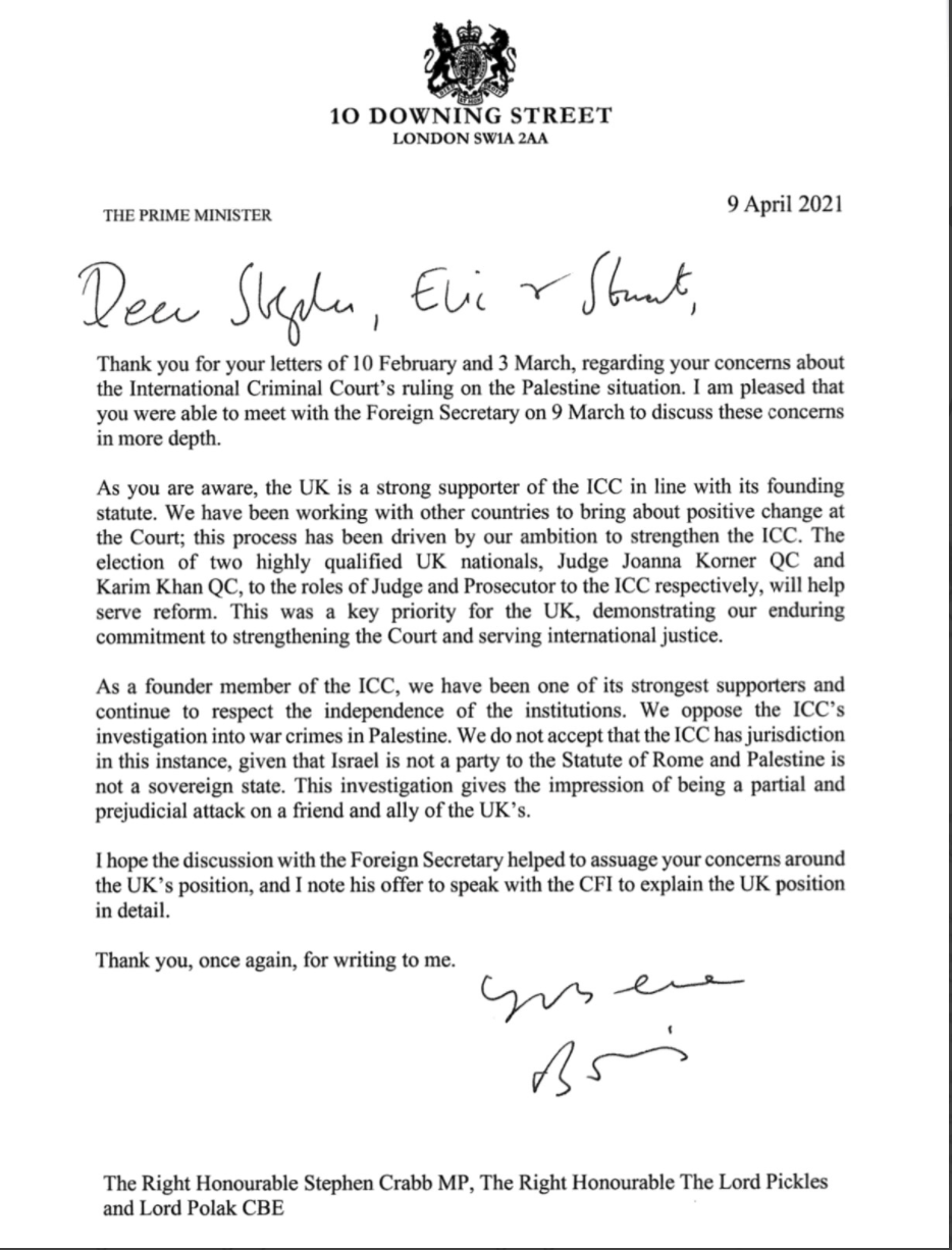 | Dear Stephen, Eric and Stuart, As you are aware, the UK is a strong supporter of the ICC in line with its founding statute. We have been working with other countries to bring about positive change at the Court’. This process has been driven by our ambition to strengthen the ICC. The election of two highly qualified UK nationals, Judge Joanna Korner QC and Karim Khan QC, to the roles of Judge and Prosecutor to the ICC respectively, will help serve reform. This was a key priority for the UK, demonstrating our enduring commitment to strengthening the Court and serving international justice. As a founder member of the ICC, we have been one of its strongest supporters and continue to respect the independence of the institutions. We oppose the ICC’s investigation into war crimes in Palestine. We do not accept that the ICC has jurisdiction in this instance, given that Israel is not a party to the Statute of Rome and Palestine is not a sovereign state. This investigation gives the impression of being a partial and prejudicial attack on a friend and ally of the UK’s. Yours ever, Boris |